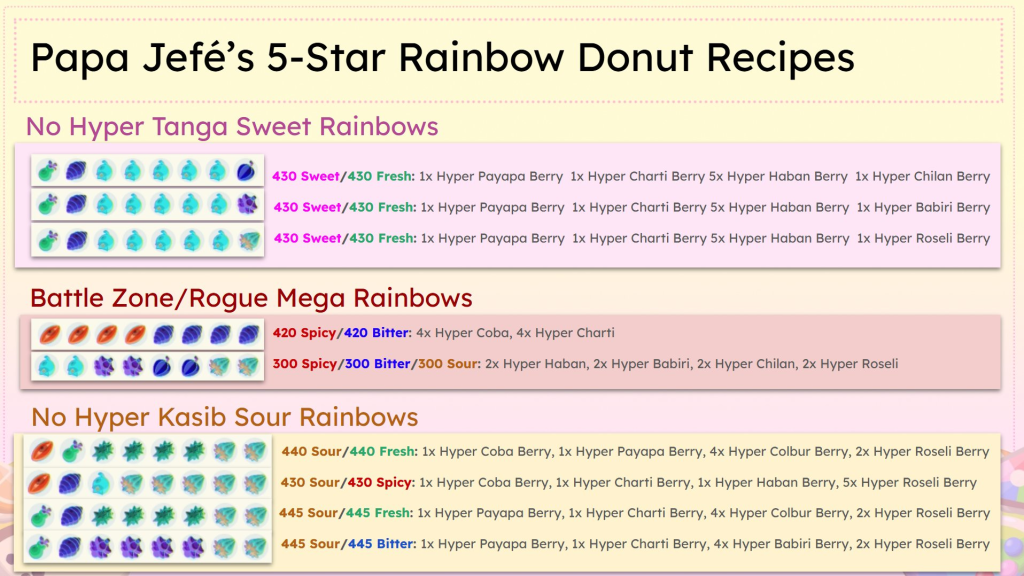 Gracias a @ItsPapaJefe en twitter, se conocen recetas que pueden dar lugar a un DONUT ARCOIRIS, el mejor donut del juego. Este donut tiene alta probabilidad de dar los mejores poderes, entre los cuales se incluye Poder variocolor 3 y Poder alfa 3.